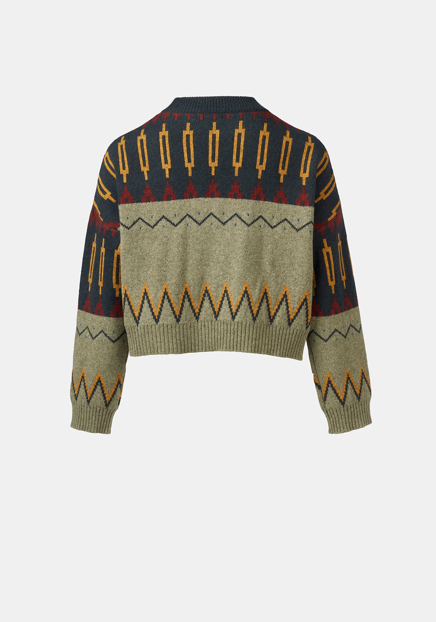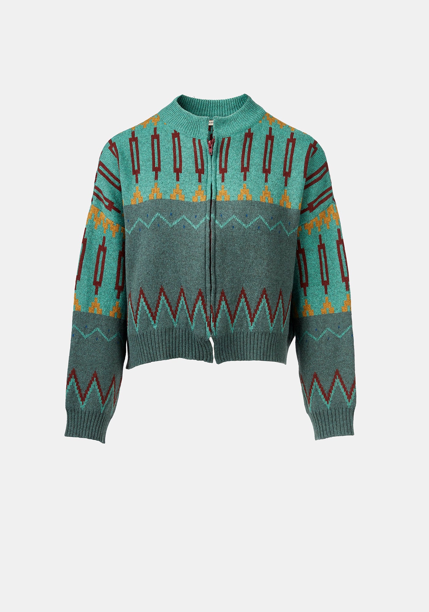 Un refinado bolero de yaco de inspiración tirolesa con una elegante cremallera central. Esta prenda moderna pero atemporal añade un toque de elegancia natural a los armarios de invierno.