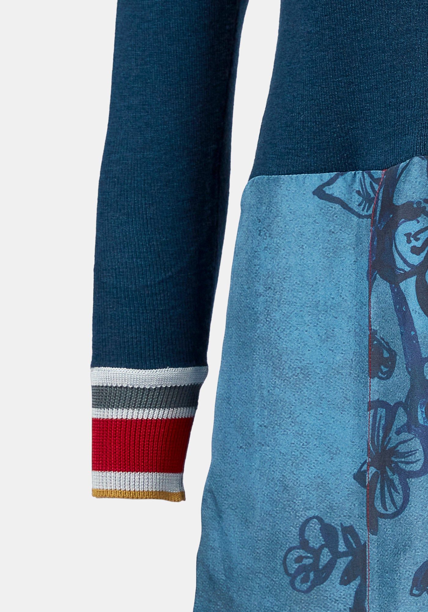 El vestit Poppy Abyss presenta un luxós top de punt de seda i caixmir amb un cridaner escot en V creuat, mànigues llargues i punys de canalé amb ratlles de disc. La faldilla de seda està estructurada amb plecs de caixa davanters i posteriors, ressaltats per costures metàl·liques i un estampat digital original de TM. Logotip estampat a la part posterior.
