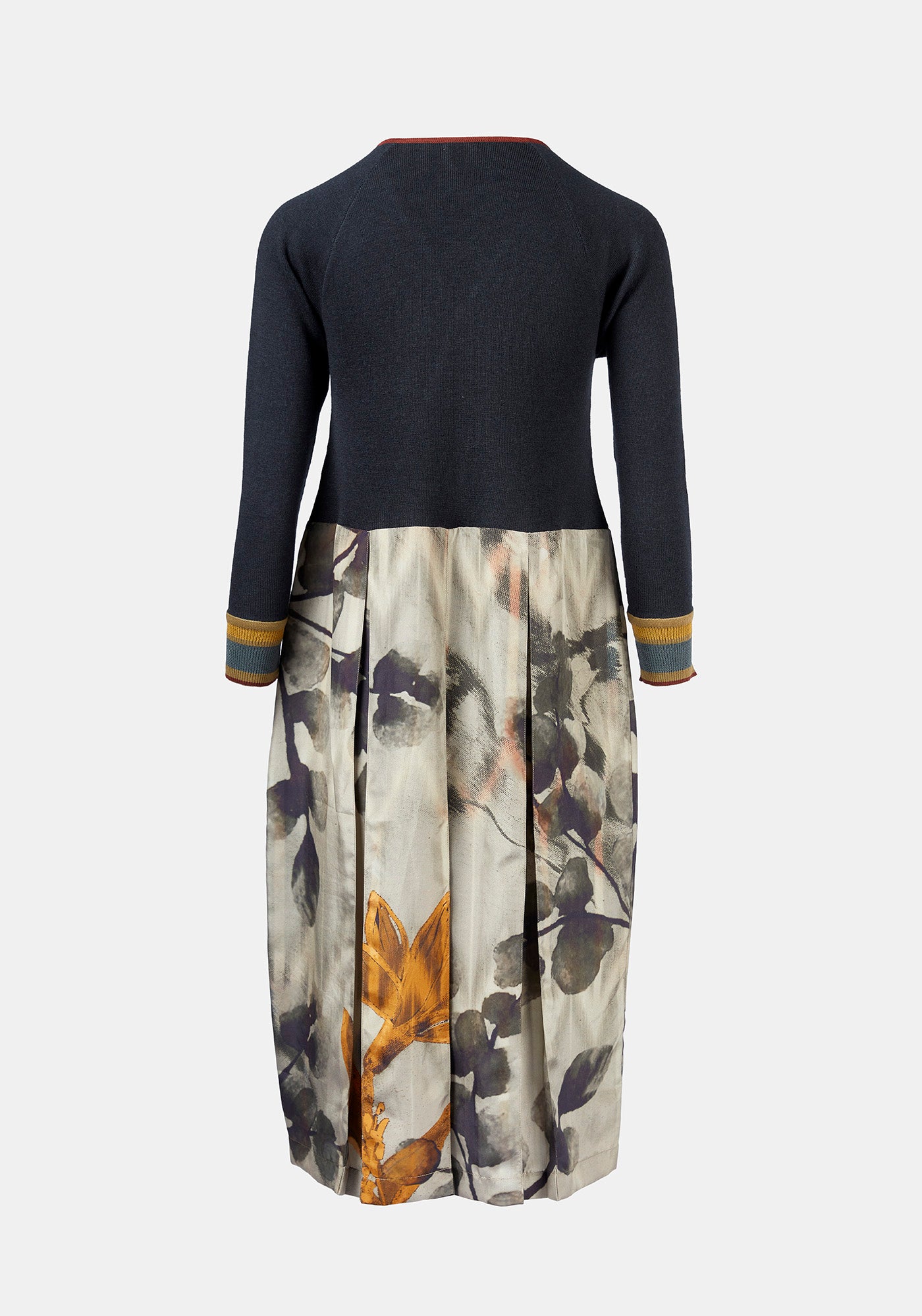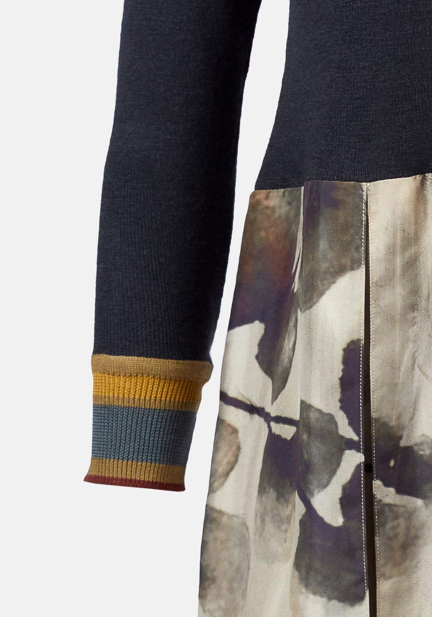 El vestit Poppy Abyss presenta un luxós top de punt de seda i caixmir amb un cridaner escot en V creuat, mànigues llargues i punys de canalé amb ratlles de disc. La faldilla de seda està estructurada amb plecs de caixa davanters i posteriors, ressaltats per costures metàl·liques i un estampat digital original de TM. Logotip estampat a la part posterior.